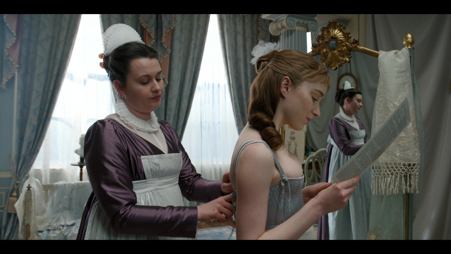 Prudence Featherington grips a maid’s hand while another laces her into a long-torsoed undergarment that - to my horror - she is wearing over her bare skin.