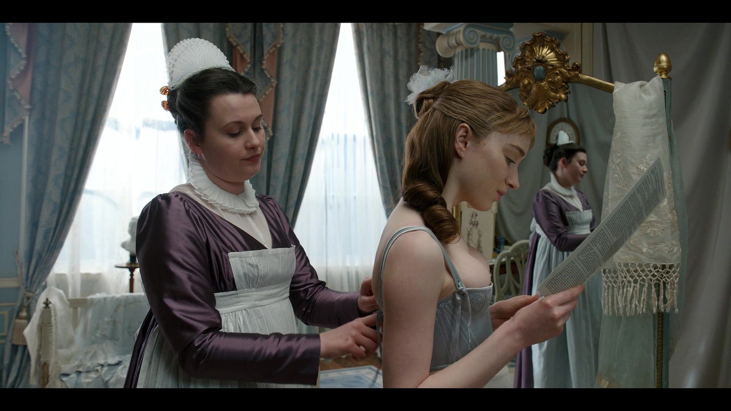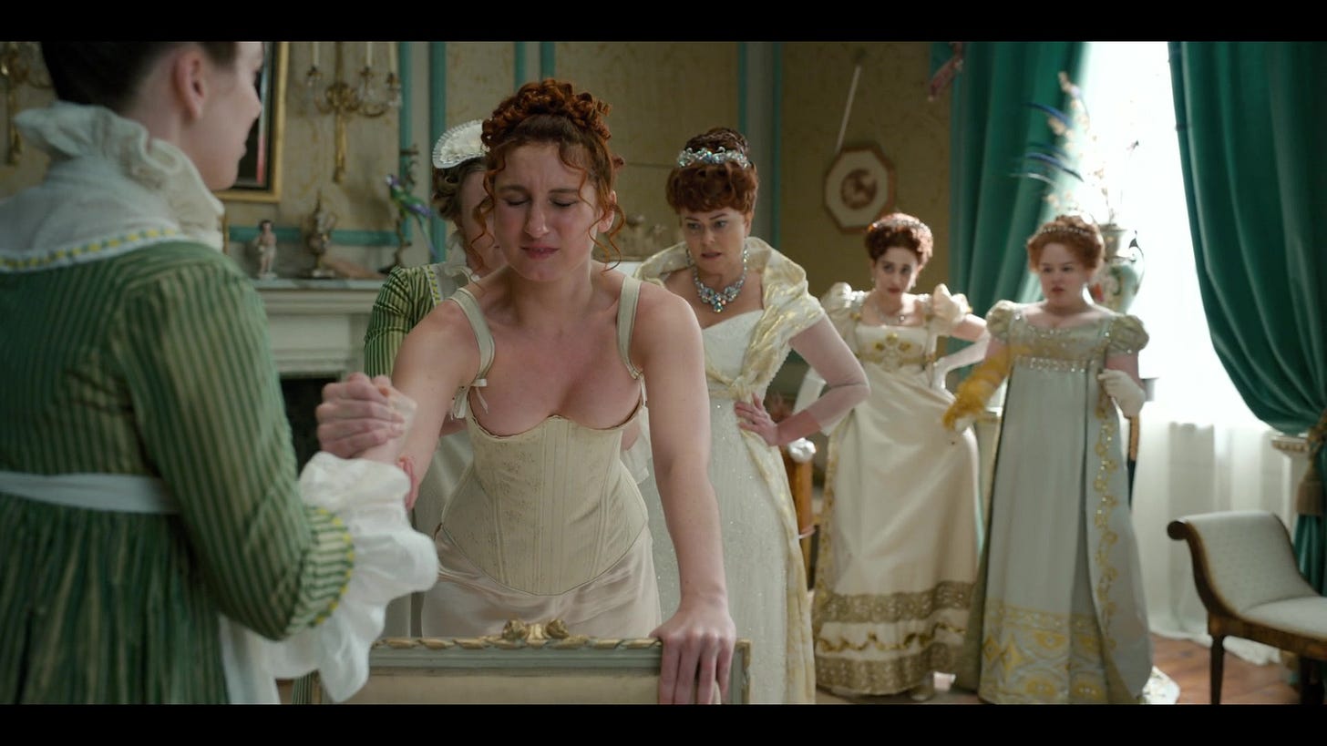 I recently rewatched Bridgerton and remembered how much the show’s costumes - which can charitably be called “fantasy Regency” - simultaneously delight and irritate me. Though Bridgerton became famous for its empire-waisted gowns, fanciful floral prints, and swoony men in cravats, linen shirts, and brocade vests, it opens with a corset.